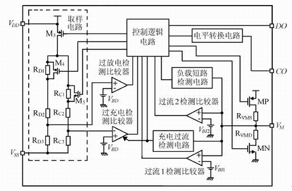 鋰離子電池保護芯片的基本功能是進行過充電保護、過guo放fang電dian保bao護hu和he過guo電dian流liu保bao護hu,其qi中zhong過guo電dian流liu保bao護hu包bao括kuo充chong電dian過guo流liu保bao護hu和he放fang電dian過guo流liu保bao護hu。下xia麵mian以yi保bao護hu電dian路lu的de基ji本ben功gong能neng為wei出chu發fa點dian,分fen析xi其qi係xi統tong的de組zu成cheng。