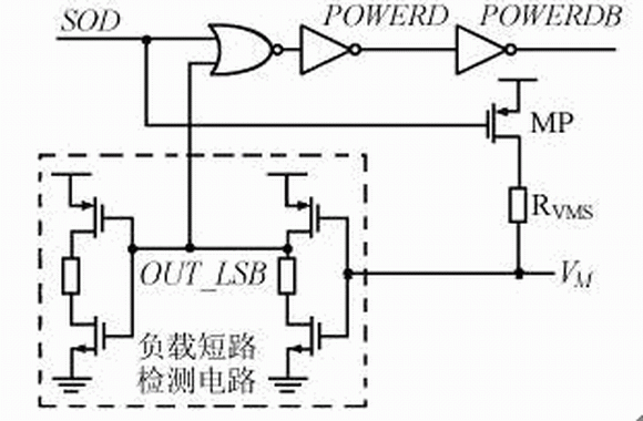 圖4 中SOD為過放電檢測信號,係統處於正常狀態時,SOD為高電平,VM為低電平,因此待機狀態控製信號POWERD輸出高電平、POWERDB輸出低電平。當係統進入過放電狀態時,SOD(延時後的信號)變為低電平,MP導通使VM變為高電平,最終使POWERD變為低電平、POWERDB變為高電平,它們控製保護電路相應模塊停止工作,係統進入待機狀態。當對電池進行充電時,由圖1可知VM被強製拉到低電平,使負載短路檢測電路的輸出信號OUT_LSB變為高電平;此時,不論SOD為何值或非門都將輸出低電平,POWERD由此變為高電平,這樣,就可實現待機狀態的退出。