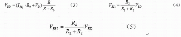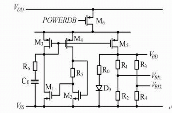 電路的工作原理為:由M1—M4和R5組成的自偏置電路產生具有正溫度係數的電流,它在電阻R0所產生的壓降和具有負溫度係數的PN 結壓降(D0上的壓降)相加,從而輸出零溫度係數的基準電壓VBD;為滿足同一電路中輸出不同的基準電壓源,利用電阻分壓將VBD 分成了VBI1及VBI2輸出;C0和R6組成啟動電路。