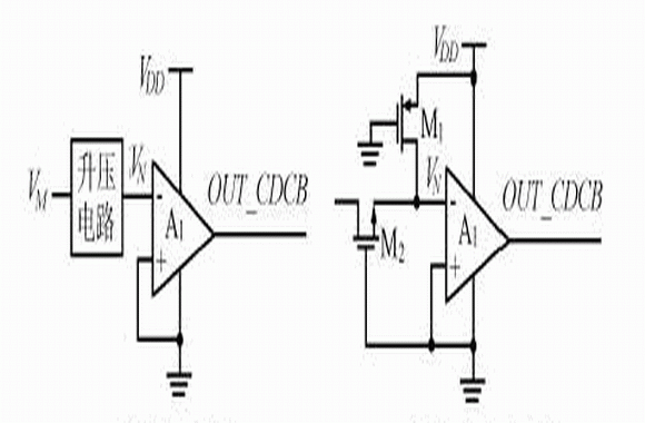 PMOS管M1和NMOS管M2的柵極都接地。當M1的柵源電壓小於它的閾值電壓時,M2截止,而M1始終導通,A1比較器的反相輸入信號VN電位因為大於同相輸入端的電位,而使輸出OUT_CDCB為低電平。隨著輸入信號VM電位向負方向的增大,M2逐漸導通,最後使得VN 端電位變負,OUT_CDCB由此變為高電平。圖6中VN=0時的輸入電壓即為檢測電壓VCHA,此時M1和M2處於飽和狀態且下列關係式成立:
