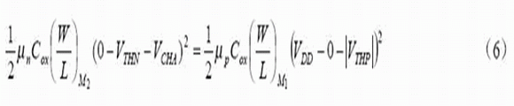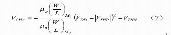 (6)式中, un和up分別為N管和P管的遷移率,VTHN和VTHP分別為N管和P管的閾值電壓,COX為氧化層電容。(6)式經整理得: