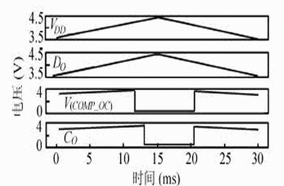 0V 電池充電抑製功能發生在充電過程中,此時,IN_LCB=‘0’,IN_LC=‘1’,VA 為高電平。當電池電壓VDD小於或等於1V時,M5關閉,另外,較小的電池電壓使其內阻變小,接近內部短路。在這種情況下充電,充電電流一定很大,導致VM的電位下降很大,使M6 導通,VB由低電平轉化為高電平,CO端輸出電位接近VM電位。