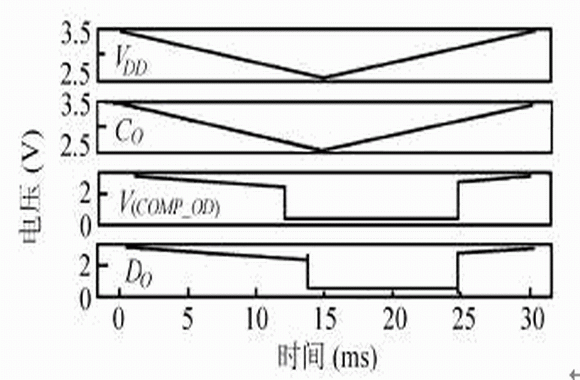 由(7)式可知,本電路中檢測電壓|VCHA|的取值隻能大於M2的閾值電壓,改變M1和M2的寬長比可改變檢測電壓VCHA。當M2未導通時,電路消耗的電流較小;當M2導通時,就會有電源到地的通路,為了減小消耗的電流,一般取M1的寬長比小於1。