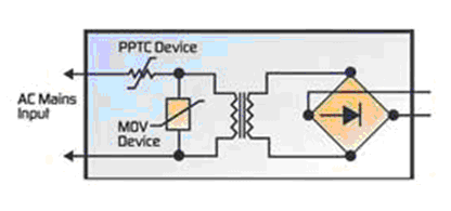 金屬氧化物壓敏變阻器具有高的通流和能量吸收能力,快的響應速度,低廉的成本,非常適合在電源端進行過壓保護。PPTC過流保護器件的額定工作電壓也是交流240V,允許最高達265V的間歇性電壓,可以與交流電源輸入線路中的壓敏變阻器安裝在一起。
