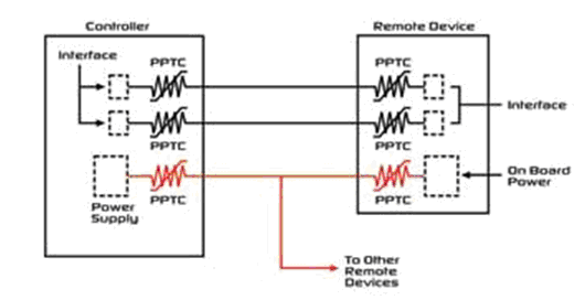 除了控製器,任何遠程傳感器、指示器,或者需要電源的製動器、模擬電路,或者通信總線接口,如果使用PPTC器件,都會給它們帶來益處(見圖3)。這些元件經常會因為接錯線路、接錯電源或者中線連接不牢固而造成損壞。
