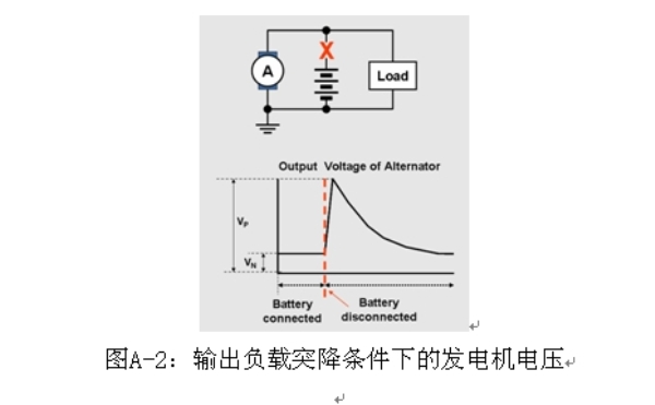以上公式適用於當前傳統的小型旅行車使用的常見的發電機,其線路電阻為:60 A輸出發電機的最小Ri為1.1 Ω,120 A輸出發電機為0.6 Ω。ISO 7637-2規定了負載突降情況下的浪湧條件為5-6-5 c)。