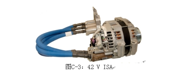用於中型混合動力係統的ISG(集成式起動機/發電機),輕型汽車為14 V,120 A,而在製動和停車期間沒有燃料噴射時,空轉引擎為42 V,60至80 A輸出。