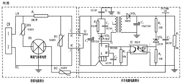 為了實現上述目的所采取的設計方案是:jiangyamindianzuhetaociqitifangdianguandedanxiangbinglianshikangleijilangyongdianluyingyongdaoyibiaodedianyuanshang。zhuyaofenweifangleidianlubufenhekaiguandianyuandianlubufen,dianlujiandan,caiyongfuheshiduichengdianlu,gongmo、差摸全保護,可以不分L、N端連接。使壓敏電阻RV1位於貼片整流模塊前端分別與電源L、N並聯,主要來鉗位L、N線間電壓,壓敏電阻RV0、RV2與陶瓷氣體放電管FD1串聯後接地,RV0與FD1串聯主要是泄放L線上感應雷擊浪湧電流,RV2與FD1串聯主要是泄放由信號口串人24V參考電位上的能量,RV0、RV2短路失效後,FD1可將其與電源電路分離,不會導致失火現象。