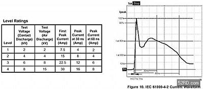 以係統級的方法來定義典型的ESD事件所采用的最常見的波形,是以其亞納秒上升時間和高電流電平(參見圖1)為顯著特征的IEC61000-4-2波形。這種波形的規範要求采用四級ESD量級。大部分設計工程師都要求把產品限定到最高級的8kV的接觸放電或15kV的空氣放電。當進行元器件級測試時,因為空氣放電測試在這樣的小型元器件上是不能重複的,接觸放電測試則是最適合的測試方式。