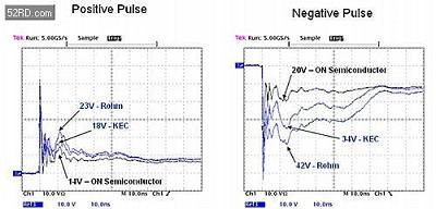 從圖3所示的圖上可見,顯然,與兩個競爭對手的器件(藍色波形)相比較,安森美半導體保護解決方案(黑色波形)可提供更低的ESD脈衝箝位電壓。與KEC的18V和Rohm的23V相比較,安森美的器件將正脈衝箝位在14V。而在負脈衝期間,這三個器件之間箝位電壓的差異更加明顯。安森美、競爭對手2和競爭對手1的器件對負脈衝的箝位電壓分別是20V、34V和42V。