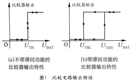 但如果在比較電路中設置兩個門限電壓:UTHH和UTHL(UTHH>UTHL),則可以形成一個滯回區,如圖1(b)所示。當電池電壓從低升高至UTHH時,比較器輸出高電平,打開電子開關,給負載供電;當電池電壓降低至UTHL時,比較器輸出低電平,斷開負載。這個時候電池端電壓雖然會迅速升高至UTHL以上,但由於達不到UTHH,所以,比較器仍然輸出低電平,負載仍被斷開,直到電池被充電後電壓升高至UTHH以上才能再次接通負載。這樣就避免了電路的振蕩,保護了負載和電池。