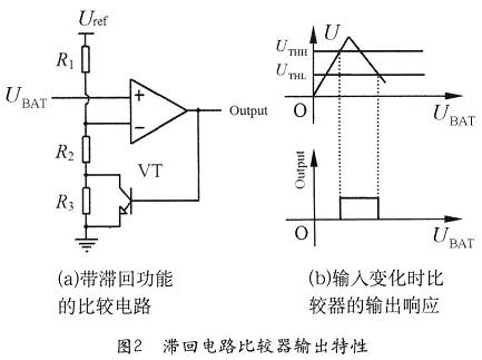 雖然絕大多數比較器中都帶有滯回電路,但通常內部滯回電路的滯回電壓(即UTHH一UTHL)僅為5mV到10mV,根本不能用於過放電保護。圖2(a)電路中利用比較器的輸出反饋自動調節比較電壓的參考值,使輸入電壓在不同的區間時,被比較的門限電壓在UTHH和UTHL之間轉化。圖2(b)給出了輸入信號變化時的輸出響應,利用比較器的輸出信號來驅動電子開關,當Output為高時,電池被接入係統,當Output為低時,負載被斷開。