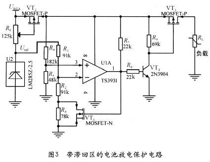圖3是具體的硬件電路圖,參考電壓由LM285Z一2.5分流穩壓器產生,它最低隻需要10μA的通過電流就可輸出穩定的2.5V參考電壓,這可大大降低電池在低壓閉鎖狀態的功耗。比較器選用了ST公司TS393I,它是一種微功耗比較器,這樣,所有分壓電阻的阻值可以選的很大,進一步降低了功耗。比較器的輸出控製P溝道的MOSFET、VT3接通或斷開負載。當電池電壓降低到一定程度時VT2關斷,使得由比較器組成的保護電路與電池斷開,極大地減小的電池的能量消耗,電池處於一種近似自然放電的狀態;當電池電壓恢複時,VT2自然導通,保護電路重新恢複工作。