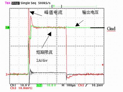 如果我們采用一個32mΩ的NTB52N10T4、100V的FET及一個5mΩ的感應電阻,在短路時FET的電流將被限製在10A,超過500μs斷路器就會關閉FET。圖2顯示-48V應用中的短路波形。