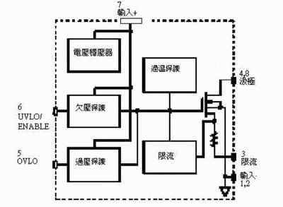 該(gai)集(ji)成(cheng)器(qi)件(jian)包(bao)括(kuo)用(yong)戶(hu)可(ke)選(xuan)擇(ze)的(de)欠(qian)壓(ya)和(he)過(guo)壓(ya)保(bao)護(hu)級(ji),以(yi)及(ji)一(yi)個(ge)可(ke)調(tiao)的(de)啟(qi)動(dong)限(xian)流(liu),利(li)用(yong)一(yi)個(ge)電(dian)阻(zu)就(jiu)可(ke)將(jiang)電(dian)流(liu)從(cong)最(zui)大(da)值(zhi)向(xiang)下(xia)調(tiao)。它(ta)還(hai)集(ji)成(cheng)了(le)一(yi)個(ge)內(nei)部(bu)過(guo)熱(re)保(bao)護(hu)電(dian)路(lu),從(cong)而(er)大(da)大(da)增(zeng)加(jia)了(le)短(duan)路(lu)和(he)過(guo)載(zai)情(qing)況(kuang)下(xia)該(gai)器(qi)件(jian)的(de)可(ke)靠(kao)性(xing)。