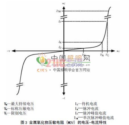 金屬氧化物壓敏電阻(MOV)的電壓-電流特性見圖3,金屬氧化物壓敏電阻(MOV)特性參數見表1。氣體放電管(GDT)的電壓-電流特性見圖4,氣體放電管(GDT)特性參數見表2。