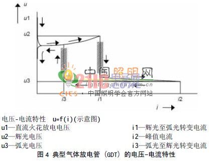 由於浪湧幹擾所致,一旦加在氣體放電管兩端的電壓超過火花放電電壓(圖4的u1)時,放電管內部氣體被電離,放電管開始放電。放電管端的壓降迅速下降至輝光放電電壓(圖4的u2)(u2在表2中的數值為140V或180V,與管子本身的特性有關),管內電流開始升高。隨著放電電流的進一步增大,放電管便進入弧光放電狀態。在這種狀態下,管子兩端電壓(弧光電壓)跌得很低(圖4的u3)(u3在表2中數值為15V或20V,與管子本身的特性有關),且弧光電壓在相當寬的電流變動範圍(從圖4的i1→i2過程中)內保持穩定。因此,外界的高電壓浪湧幹擾,由於氣體放電管的放電作用,被化解成了低電壓和大電流的受保護情況(u3和i2),且這個電流(從圖4的i2→i3)經jing由you氣qi體ti放fang電dian管guan本ben身shen流liu回hui到dao幹gan擾rao源yuan裏li,免mian除chu了le幹gan擾rao對dui燈deng具ju可ke能neng帶dai來lai的de危wei害hai。隨sui著zhe浪lang湧yong過guo電dian壓ya的de消xiao退tui,流liu過guo氣qi體ti放fang電dian管guan的de電dian流liu降jiang到dao維wei持chi弧hu光guang放fang電dian狀zhuang態tai所suo需xu的de最zui小xiao值zhi以yi下xia(約為10mA~100mA,與管子本身的特性關),弧光放電便停止,並再次通過輝光放電狀態後,結束整個放電狀態(熄弧)。