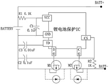單節鋰電池保護IC的應用電路很簡單,隻需外接2個電阻、2個電容和2個MOSFET,其典型應用電路如圖1所示。