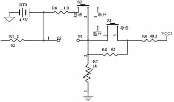 根據鋰電池保護IC的工作原理設計的測試電路如圖2所示,圖3詳細說明了圖2中模塊B的電路。模塊A在測試過流保護時為CS引腳提供電壓,模擬圖1中的CS引腳所探測到的電壓。調整模塊中的可變電位器可為CS引腳提供可變電源,控製其中的跳變開關可為CS提供突變電壓。模塊B為電源,模擬為IC提供工作電壓。調整電路中的可變電位器R7可為整個電路提供一個可變電壓,在測試過充電保護電壓和過放電保護電壓時使用。控製模塊中的開關S1的閉合為測試電路提供一個跳變電源,在測試IC的過充、過放和過流延遲時使用。