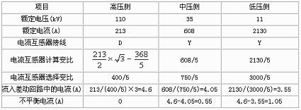 實例:一台三相三繞組降壓變壓器,容量Se=40.5MVA,電壓110±2×2.5%kV/385±2×2.5%kV/11kV,接線方式:Ydd11-11,變壓器額定電流:213A/608A/2130A。主變差動保護采用BCH-2型差動繼電器。基本計算如表1所示,已確定110kV側為基本側。
