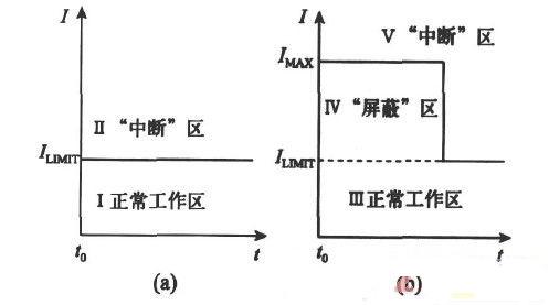 當負載電流超過限製電流ILIMIT 不太多且持續作用時間不太長時,我們希望過流保護電路能保持LDO 不中斷工作,因此需要采用“屏蔽”模式屏蔽掉部分可以讓LDO 不中斷運行的過流信號,對於過流幅值和持續作用時間超過範圍的過流信號,過流保護電路又能采取中斷LDO 工作的模式。傳統的“中斷”模式電流保護電路工作狀態如圖1(a)所示,分為正常工作區Ⅰ和“中斷”區Ⅱ,當負載電流不超過ILIMIT 時,LDO 工作在正常工作區,當負載電流超過ILIMIT 時LDO 進入“中斷”區。加入“屏蔽”模式後的過流保護電路工作狀態如圖1(b),分為正常工作區Ⅲ、屏蔽區Ⅳ以及中斷區Ⅴ,當負載電流小於ILIMIT 時,LDO 處於正常工作區,當過流信號的幅值在ILIMIT 和最大幅值電流IMAX 之間,持續作用時間在t=tMAX 之內即同時滿足ILIMIT ≤ ILOAD ≤ IMAX,t ≤tMAX 時,LDO 進入屏蔽區,這個範圍之外的過流信號將進入中斷區。對比圖1(a)和(b)可以看出,改進過流保護電路後的LDO 的正常工作區包括圖1(b)的正常工作區Ⅲ和“屏蔽”區Ⅳ,增大了工作區的範圍,提高了LDO 的工作效率。