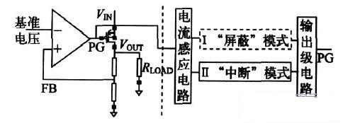 包含過流保護電路的LDO整體框圖如圖2所示,虛線左邊是LDO 主體電路,包括誤差放大器、功率管、負(fu)載(zai)電(dian)阻(zu)以(yi)及(ji)分(fen)壓(ya)電(dian)阻(zu)。虛(xu)線(xian)右(you)邊(bian)部(bu)分(fen)為(wei)電(dian)流(liu)保(bao)護(hu)電(dian)路(lu),主(zhu)要(yao)作(zuo)用(yong)是(shi)感(gan)應(ying)並(bing)檢(jian)測(ce)負(fu)載(zai)電(dian)流(liu)是(shi)否(fou)超(chao)過(guo)限(xian)製(zhi)電(dian)流(liu),然(ran)後(hou)通(tong)過(guo)控(kong)製(zhi)功(gong)率(lv)管(guan)來(lai)決(jue)定(ding)是(shi)否(fou)使(shi)LDO 中斷運行,包括電流感應電路和控製電路。傳統的過流保護電路隻采用圖2 中實框Ⅱ所示的“中斷”模式(不包括虛框),對於任何負載過流情況,不論持續作用時間如何,都使LDO 中斷工作;本文在傳統的“中斷”模式基礎上,增加了“屏蔽”模式(如圖2 中虛框Ⅰ),能有效屏蔽希望LDO不中斷工作的過流信號,使LDO更高效運行,同時保留“中斷”模式,保證LDO 安全工作。