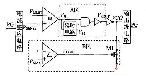 圖3 是改進前後的過流保護電路圖。不加虛框部分是傳統的“中斷”模式過流保護電路,由電流感應電路、比較電路以及輸出級電路組成。電流感應電路采樣功率管電流。采樣得到的電流和限製電流ILIMIT 分別轉化為比較器的兩輸入端電壓VSENSE 和VLIMIT 並進行比較,得到VCO。VCO作用於輸出級電路以控製功率管柵極電壓。如果負載過流,過流保護電路使得功率管柵極電壓PG 為高電平,強行使LDO中斷。