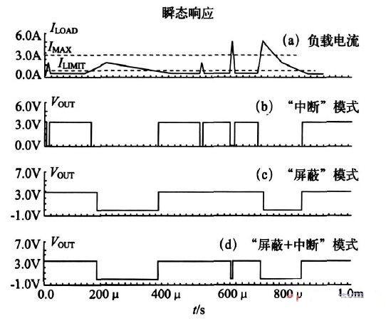 圖5 中(a)曲線表示負載電流幅值和作用時間的關係,ILIMIT 和IMAX 分別為限製電流和最大幅值電流。圖5 中(b)、(c)和(d)曲線分別為采用傳統“中斷”模式、“屏蔽”模式以及“屏蔽+ 中斷”模式過流保護電路後LDO 的輸出電壓波形。