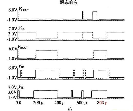 “屏蔽”模式的邏輯關係如圖4 所示,其中VB1和VCOUT 分別為比較器甲和乙的輸出信號,VB1 經過一個延遲時間後輸出信號為VB2,屏蔽電路輸出電壓為VBOUT,VCO為屏蔽電路的輸出端。VB1、VB2和VBOUT的波形反應了屏蔽電路的邏輯關係,隻有當VB1 和VB2 同時為高電平,VBOUT 才為低電平,否則VBOUT 一直為高電平,因此屏蔽電路屏蔽了延遲時間內的脈衝信號,保持寬脈衝信號;VCOUT為使能端,隻要VCOUT為高電平,VCO 立即變為低電平。