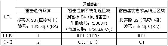 不同條件下低壓係統和通信線纜雷電流浪湧預計值如表2、表3所示(來源於IEC62305-1.表E.2)。LPL為雷電防護等級。