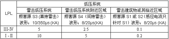 在LPZ0B(LPZ1或更高的防護區)之內的各種線路浪湧主要來自LEMP感應產生的,就應選用In(8/20μS)測試的SPD或用組合波(1.2/50μS, 8/20μS)測試的SPD。