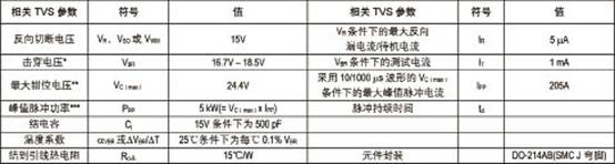 表1:熱插拔電路TVS元件的規格和細節(Littelfuse5.0SMDJ15A)
