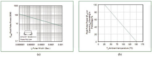 圖3 Littelfuse 5.0SMDJ15A TVS(a)峰值脈衝功率與脈衝持續時間,(b)熱降額特性