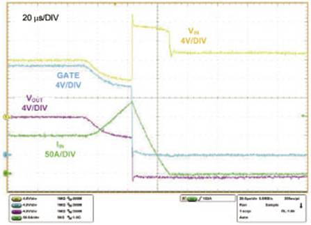 由於在檢測到故障之前允許建立起盡可能高的電流,圖1中電路的輸出兩端直接拉低的零阻抗短路尤其麻煩。在短路故障響應時間之後,通路MOSFET最終是由“斷路器”故障條件下的熱插拔控製器命令關閉的,同時正向電流迅速被中斷。