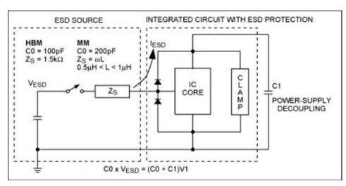 靜電放電強度以電壓形式表示,該電壓由電容的儲能電荷產生,最終傳遞到IC。作用到IC的電壓和電流強度與IC和ESD源之間的阻抗有關。對電荷來源進行評估後建立了ESD測試模型。