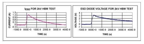如果對IC引腳進行 HBM測試,測試電路的初始電壓是2kV,通過ESD二極管的電流約為1.33A(圖2):