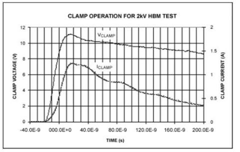 箝位二極管在IC其它電路遭到破壞之前導通,箝位管要有足夠的承受力,保證ESD電流不會導致二次擊穿。2kV HBM測試的箝位過程如圖5所示,圖5中的電壓包括I-R壓降和突變穩定後的箝位電壓。