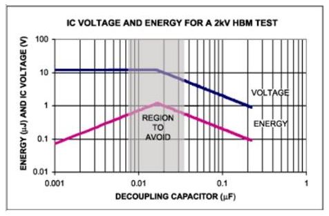 對於高速雙極型IC,HBM測試中吸收的最大能量是1μJ;2kV人體模式下,如果電容小於0.02μF(圖 6),C1>>C0二極管會產生動作。為了使去耦電容的能量低於1μJ,去耦電容有兩種選擇:要麼容值大於0.05μF,要麼小於 0.005μF。當使用更高的測試電壓時,要按比例增大0.05μF電容的尺寸。