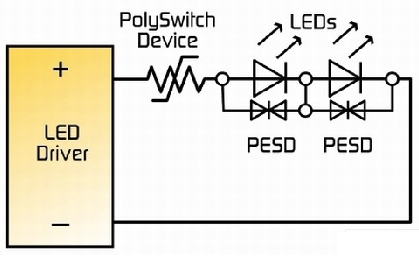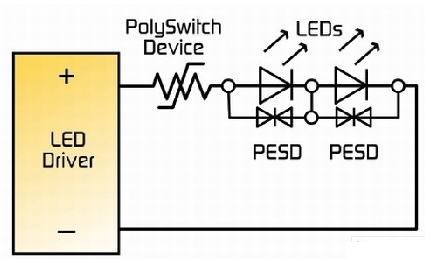 電源線耦合電壓瞬變和浪湧也可以降低LED的預期使用壽命,許多的LED驅動器容易受到不合適的DC電壓水平和極性的破壞。LED驅動器的輸出也可能被短路破壞或者摧毀。大多數LCD電視應用的LED驅動器包括內置安全裝置,包括熱關閉以及開路、短路LCD檢測。然而,可能還需要另外的過流保護元件以幫助保護集成電路(IC)以及其它敏感的電子元件。PolySwitch元yuan件jian也ye可ke以yi被bei用yong來lai幫bang助zhu防fang止zhi當dang監jian測ce器qi的de冷leng卻que口kou被bei堵du塞sai時shi可ke能neng發fa生sheng的de熱re失shi控kong情qing況kuang。由you於yu其qi具ju有you對dui溫wen度du過guo高gao的de情qing況kuang有you檢jian測ce和he反fan應ying的de能neng力li,一yi個ge安an裝zhuang合he適shi的dePolySwitch元件可以在LCD沒有足夠電壓運行的情況下中斷電流。