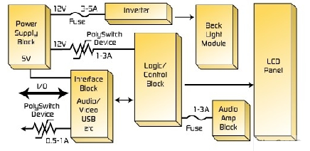 圖3顯示了在LCD電視監測器中PolySwitch元件可以安放的位置,以幫助提供過電流保護。為了充分發揮PolySwitch元件的影響,可以將其和金屬芯電路板或者LCD散熱片熱結合在一起。如果LCD沒有內置的ESD保護,可以向ESD並聯一個PESD保護元件,以幫助避免由ESD電壓浪湧造成的破壞。