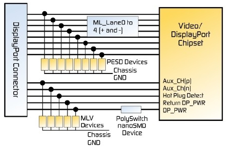 圖4. 典型的運用MLV元件, PESD抑製元件以及PolySwitch過電流保護元件的顯示端口電路保護設計