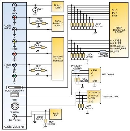 MLV提供了低電容的分路保護並且提供了LCD電視應用的高電流處理和能量吸收的過電壓保護。PESD組件被安裝在數據線上以幫助ESD避開敏感的電路係統。PESD的低電容幫助阻止高數據速率信號的降低。