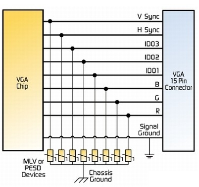 LCD電視上的VGA端口起到從一個計算機視頻卡有效連接的作用。ESD或者電纜脫落情況可以引起VGA端點的故障。IEC 61000-4-2要求在這裏是可行的,並且諸如PESD 和3pF MLV
