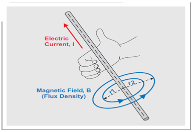 圖 1 顯示了 DC 電流的磁通密度 B。就 AC 電流而言,將右手定則用於兩個方向,磁場和 AC 電流都隨同一個頻率 f 而變化:B(f) ~ I(f)。磁場(或者更加精確的說法是磁通密度及其相應磁場強度)隨導體中心軸距離的增加而減弱。這些關係可以表示為: