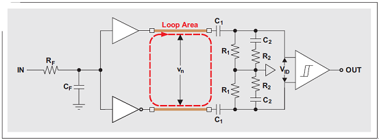 電容隔離器由兩塊矽芯片—一個發送器和一個接收機組成(請參見圖 2)。數據傳輸在由兩個電容構成的差動隔離層之間進行,在每個電容的二氧化矽 (SiO2) 電(dian)介(jie)質(zhi)兩(liang)端(duan)都(dou)有(you)一(yi)塊(kuai)銅(tong)頂(ding)片(pian)和(he)一(yi)個(ge)導(dao)電(dian)矽(gui)底(di)片(pian)。發(fa)送(song)器(qi)芯(xin)片(pian)的(de)驅(qu)動(dong)器(qi)輸(shu)出(chu)通(tong)過(guo)一(yi)些(xie)接(jie)合(he)線(xian)連(lian)接(jie)到(dao)接(jie)收(shou)機(ji)芯(xin)片(pian)上(shang)隔(ge)離(li)電(dian)容(rong)的(de)頂(ding)片(pian)。通(tong)過(guo)將(jiang)電(dian)容(rong)的(de)底(di)片(pian)連(lian)接(jie)接(jie)收(shou)機(ji)輸(shu)入(ru)構(gou)成(cheng)了(le)一(yi)個(ge)導(dao)電(dian)環(huan)路(lu)。圖(tu) 3 顯示了隔離層的等效電路結構圖,並標示出了金接合線之間的環路區域。很明顯,穿過該環路的磁場將會產生一個 EMF,其表示下麵 RC 網絡的輸入電壓噪聲 Vn1。我們常常碰到的第二種差動噪聲部分 Vn2,其產生原因是共模噪聲到差動噪聲的轉換。兩個噪聲分量共同組成了綜合噪聲 Vn。如果隻考慮 EMF 的影響,則可以保守地將 Vn 一分為二: