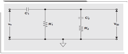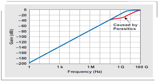 一次電路仿真證實了 RC 網絡為一個一階高通濾波器,其 C′1 和 R′1 為主要組件,頻率高達 100 MHz(參見圖 5 中藍色曲線)。超出這一頻率以後,寄生組件 C′2 和R′2生效,從而引起稍稍偏離於線性的斜率。因此,頻率達到 100 MHz 以後,增益響應可以表示為 VID/vn 的比: