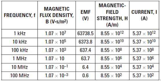 其中,B 為以第平方米伏秒 (V•s/m2) 表示的磁通密度,μ0 為自由空間中的磁導率(計算方法為 4π × 10–7 V•s/A•m),I 為以安培為單位的電流,r 為以米為單位的導體距離,而 H 為以安培每米 (A/m) 為單位的磁場強度。