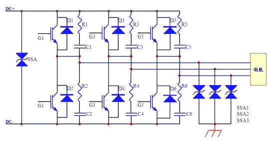 在集電極和發射極之間並接RC濾波電路,可有效地抑製關斷過電壓和開關損耗。但在實際應用中,由於DC電源前端的浪湧突波會使集電極過電壓,並使RC濾波電路部分的抑製效果生效,IGBT通常都會被擊穿或者短路。另外,在電機起動時,由於起動時的大電流,在主線路中分布的電感亦會造成較大程度的感應過電壓,使IGBT損壞。同時,電機勵磁造成的感應電動勢,對電路的破壞也相當地大——工程師們經常沒有考慮到這一點。