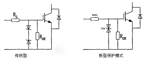 傳統保護模式:防護方案防止柵極電荷積累及柵源電壓出現尖峰損壞IGBT——可在G極和E極之間設置一些保護元件,如下圖的電阻RGE的作用,是使柵極積累電荷泄放(其阻值可取5kΩ);兩個反向串聯的穩壓二極管V1和V2,是為了防止柵源電壓尖峰損壞IGBT。另外,還有實現控製電路部分與被驅動的IGBT之zhi間jian的de隔ge離li設she計ji,以yi及ji設she計ji適shi合he柵zha極ji的de驅qu動dong脈mai衝chong電dian路lu等deng。然ran而er即ji使shi這zhe樣yang,在zai實shi際ji使shi用yong的de工gong業ye環huan境jing中zhong,以yi上shang方fang案an仍reng然ran具ju有you比bi較jiao高gao的de產chan品pin失shi效xiao率lv——有時甚至會超出5%。相關的實驗數據和研究表明:這和瞬態浪湧、靜電及高頻電子幹擾有著緊密的關係,而穩壓管在此的響應時間和耐電流能力遠遠不足,從而導致IGBT過熱而損壞。