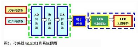 傳感器作為信號采集和機電轉換的器件,其機電技術都已相當成熟,近幾年MEMS技術興起又將傳感器技術向小型化、智能化、多功能化、低成本化大踏步邁進。光敏傳感器、紅外傳感器等各種類型的傳感器都可與LED照明燈具組成一個智能控製係統,傳感器將采集來的各種物理量信號轉換成電信號,可以經由集成電路化的AD轉換器、MCU、DA轉換器對所采集的信號進行智能化處理,從而控製LED照明燈具開啟和關閉。人類可以籍此在MCU上設定各種控製要求,控製LED燈的開關時間、亮度、顯色、多彩變幻,從而達到省電節能的目標。傳感器與LED燈具組成的係統框圖如圖1所示。目前的集成電路製造技術已經可以將AD、DA、MCU集成在一個5X5mm或更小的封裝內,安裝在燈具內既不占麵積而且十分方便。